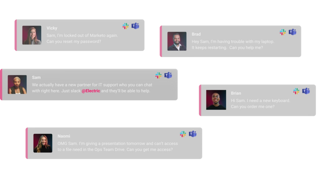 Activate the Electric App in your Slack workspace or Microsoft Teams tenant, giving your team access to chat Electric’s 100+ IT technicians from wherever they work.